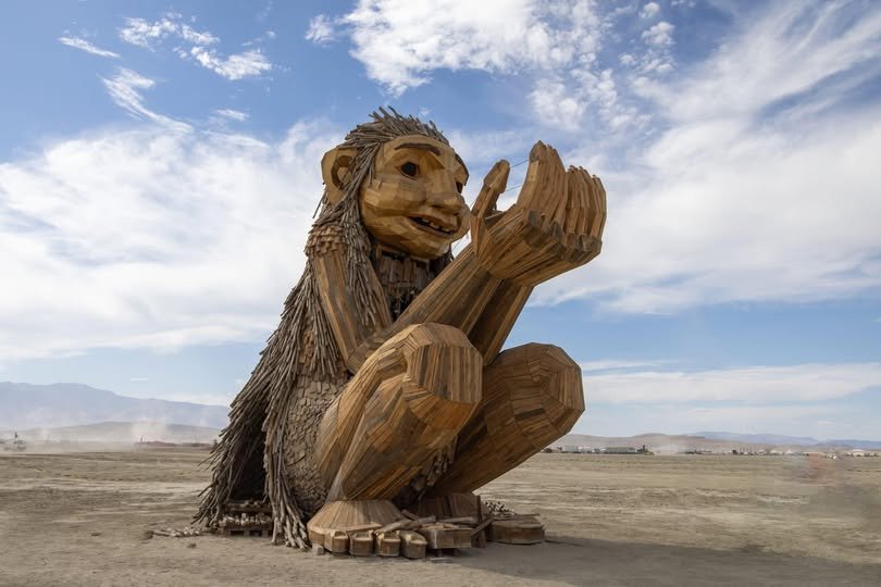 A giant troll crafted from recycled wood at Burning Man, Rose Wonders invites people to climb, sit, and interact — a playful example of how creative sculpture can reshape public engagement with art.