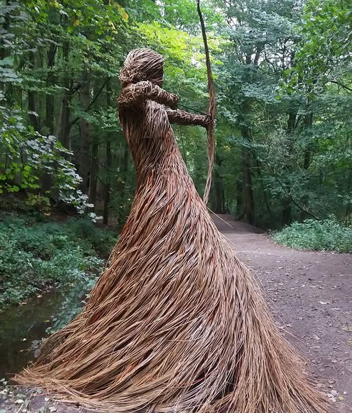 Standing among trees, this willow sculpture merges seamlessly with its forest setting. Its elegant form — like fabric caught in motion — evokes both earth and mythology.