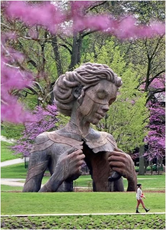 Monumental and wooden, Hallow opens its wooden body toward the sky, framing nature itself as part of the sculpture. It celebrates openness, inner space, and reconnection with the environment in an age of concrete cities.