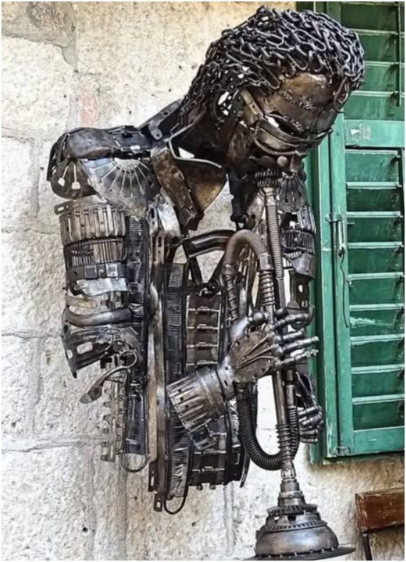 This industrial wall sculpture captures jazz legend Miles Davis mid-performance, channeling the rhythm and soul of music into metal form. It’s a striking fusion of sound and sculpture.