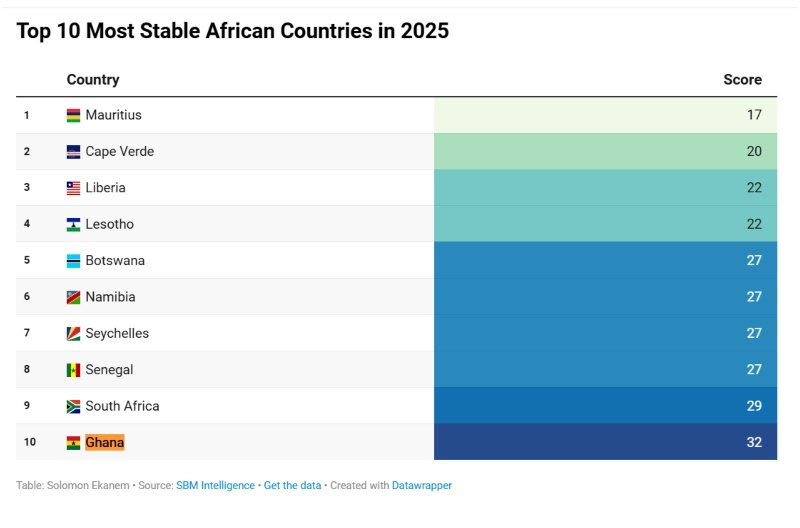 The index (PDF), compiled by Nigeria-based research firm SBM Intelligence, placed Ghana within the top 10 safest countries on the continent, crediting its steady governance, relatively resilient economy, and calm geopolitical environment. Mauritius topped the list with an exceptionally low risk score of 17, followed by Cape Verde, Liberia, and Lesotho.
