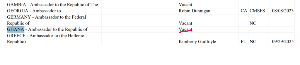 Accra, Ghana – April 18, 2026 – The United States currently has no Senate-confirmed ambassadors in Ghana, Nigeria, the Ivory Coast and 114 other countries, according to official records released by the US Department of State on April 8, 2026.