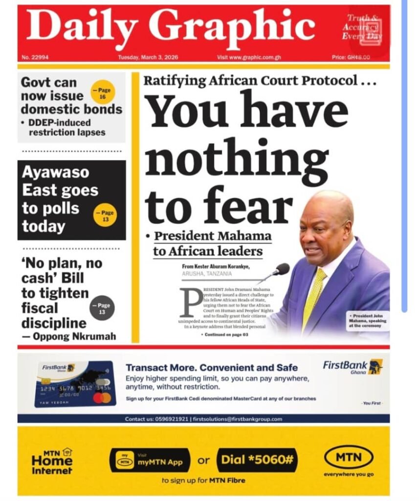 Tuesday, March 3, 2026. Stay informed with today’s front pages of Ghanaian newspapers, all in one place.