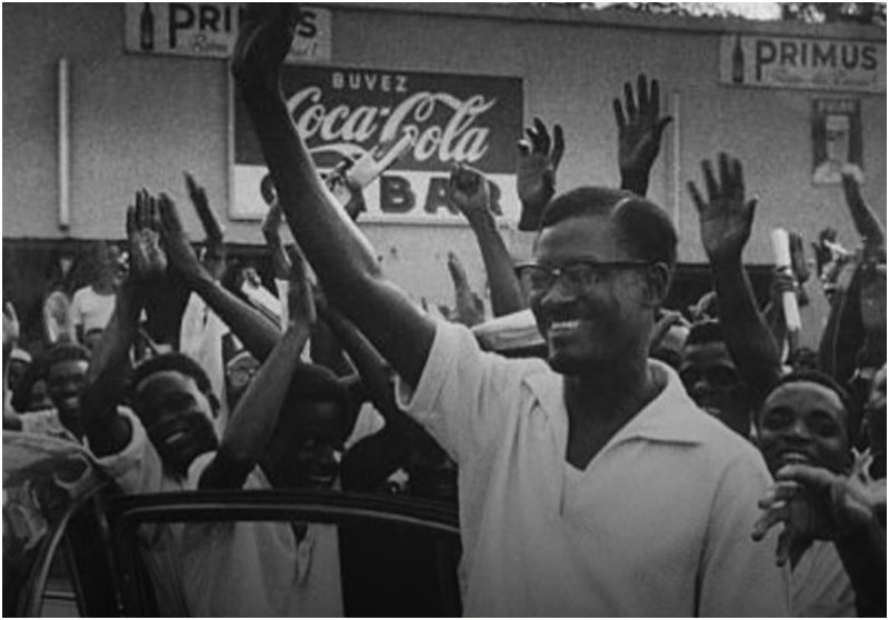 The figure stands upright and forward-facing, one arm raised, with a stern and resolute expression that has come to symbolize Lumumba’s uncompromising stance against colonial rule.