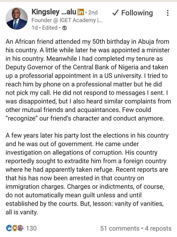 “An African friend attended my 50th birthday in Abuja from his country. A little while later he was appointed a minister in his country. Meanwhile I had completed my tenure as Deputy Governor of the Central Bank of Nigeria and taken up a professorial appointment in a US university. I tried to reach him by phone on a professional matter but he did not pick my call. He did not respond to messages I sent. I was disappointed, but I also heard similar complaints from other mutual friends and acquaintances. Few could “recognize” our friend’s character and conduct anymore.