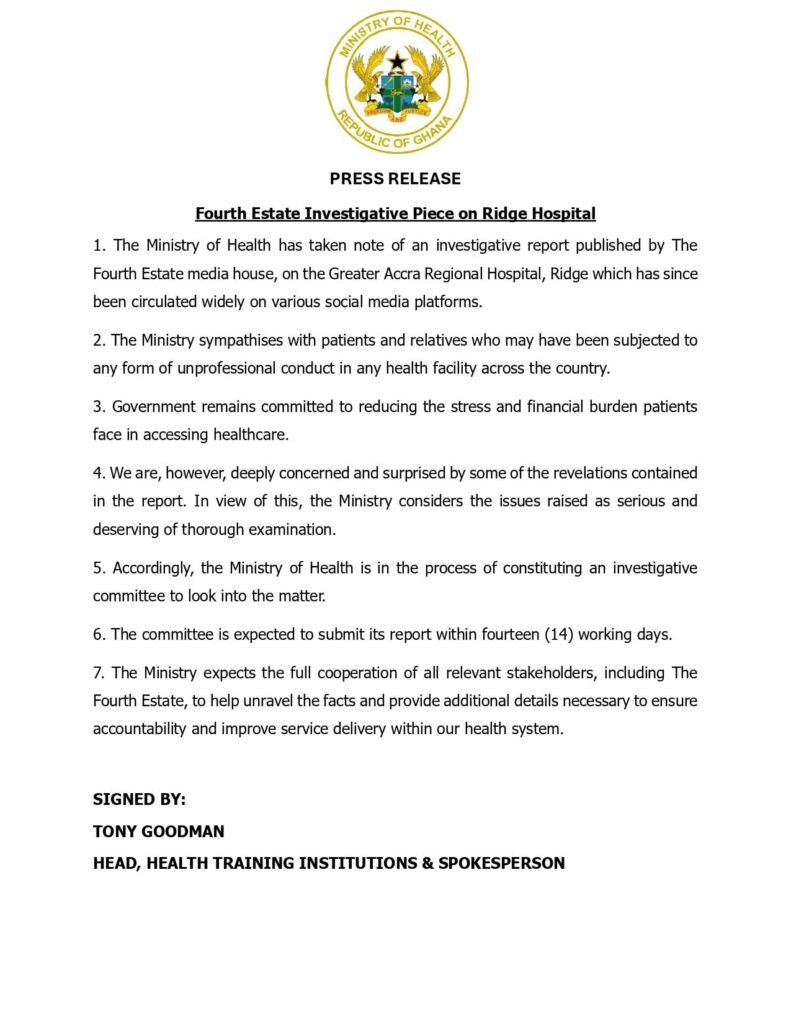 Ghana’s Ministry of Health has announced the formation of a special investigative committee to examine serious allegations of patient exploitation and unprofessional conduct at the Greater Accra Regional Hospital (Ridge Hospital).