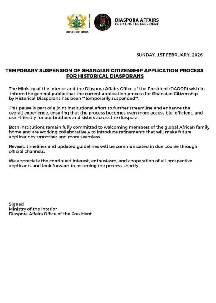 “The Government remains fully committed to the vision of a welcoming Ghana for all people of African descent. This temporary suspension is not a reversal of policy but a necessary pause to strengthen systems, review processing timelines, update eligibility guidelines where needed, and ensure the program continues to serve both diaspora applicants and the national interest in a sustainable manner.”