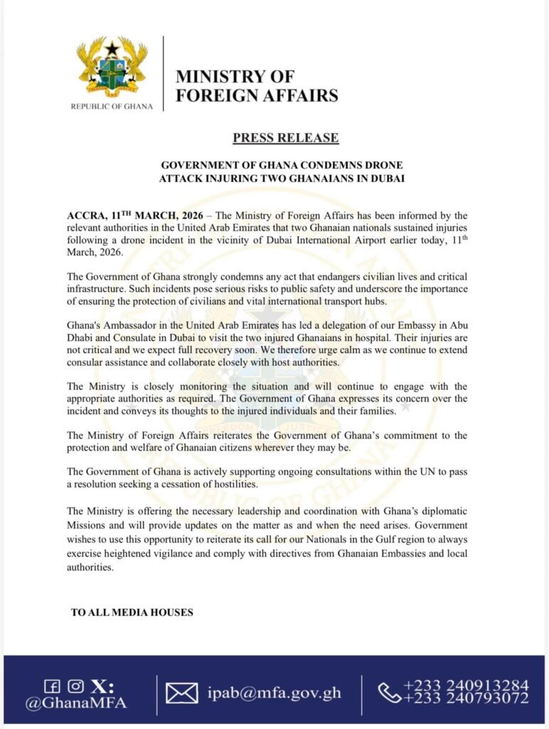 In a press release issued from Accra on Tuesday, March 11, 2026, the Ghanaian Ministry of Foreign Affairs confirmed that it was informed of the incident by relevant authorities in the United Arab Emirates.