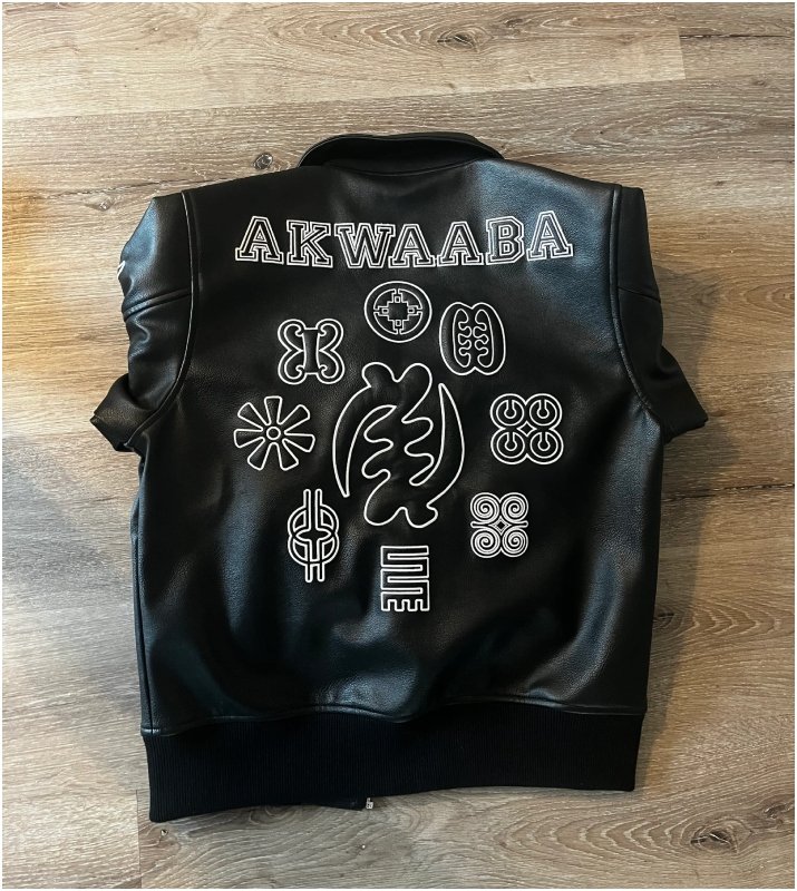 The black vegan leather jacket features “Akwaaba” — the Akan word for “welcome” — embroidered across the back in large lettering. Just beneath it sits a prominent Gye Nyame symbol, one of Ghana’s most recognizable Adinkra symbols, representing the supremacy of God. The front and sleeves are detailed with multiple Adinkra motifs, carefully stitched using raised, three-dimensional embroidery that gives the design both texture and depth.