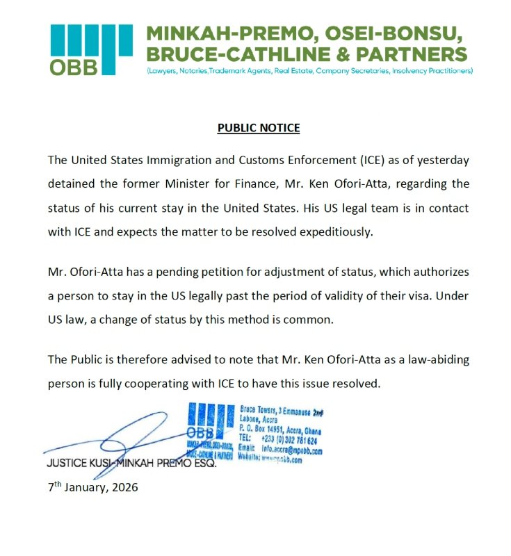 A public statement issued by his Ghana-based lawyers of Minkah-Premo, Osei-Bonsu, Bruce-Cathline and Partners, also said Ofori-Atta is cooperating fully with immigration officials and expects the matter to be resolved expeditiously through legal channels. The statement explained such adjustment of status petitions are normal under U.S. law, and that his legal team continues to engage with ICE to regularize his stay.