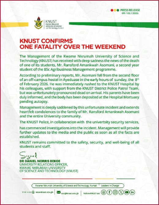 The incident has reignited discussions about safety measures in off-campus student hostels around KNUST, including the need for better balcony railings, mental health support, and emergency response protocols. Student groups have called for urgent safety audits of private hostels in Ayeduase and surrounding areas.