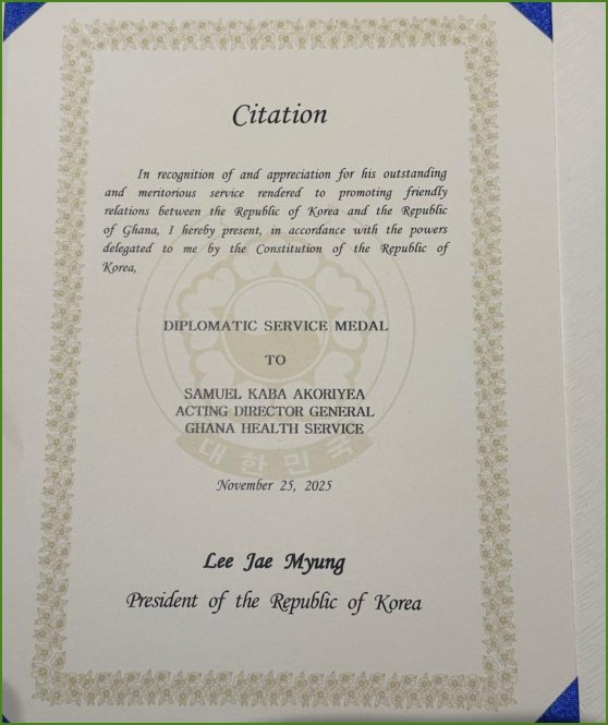 Ghana’s health diplomacy earned global recognition this week as the Acting Director-General of the Ghana Health Service (GHS), Dr Samuel Kaba Akoriyea, received the Diplomatic Service Medal from the President of the Republic of Korea, Lee Jae Myung.