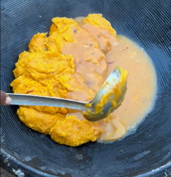 The cooking begins with fresh yams, peeled and gently cooked with tomatoes, onions, pepper, momone, kobi, and fish. Any fish works, really—local or imported—making it accessible even for those recreating it abroad. Once the vegetables soften, they’re blended into a rich base and returned to the pot. Seasoning and salt follow, then time does its work.