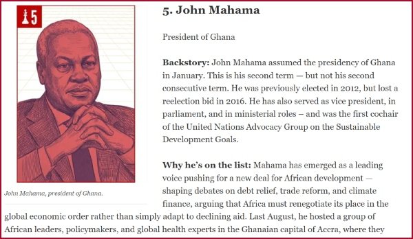 Ghana’s President John Dramani Mahama has been named the 5th Most Powerful person in the world of development and changemaking.