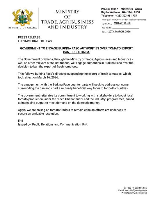 In a press statement, Ghana’s Ministry of Trade, Agribusiness and Industry described the move as a significant boost to supply and market stability. The decision follows improvements in tomato supply to local processing factories in Burkina Faso and commitments by stakeholders to prioritise domestic industrial needs.