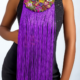 Equally eye-catching are the brand’s vibrant fringe and feathered necklaces. These pieces burst with colour and movement, instantly drawing attention to the neckline.