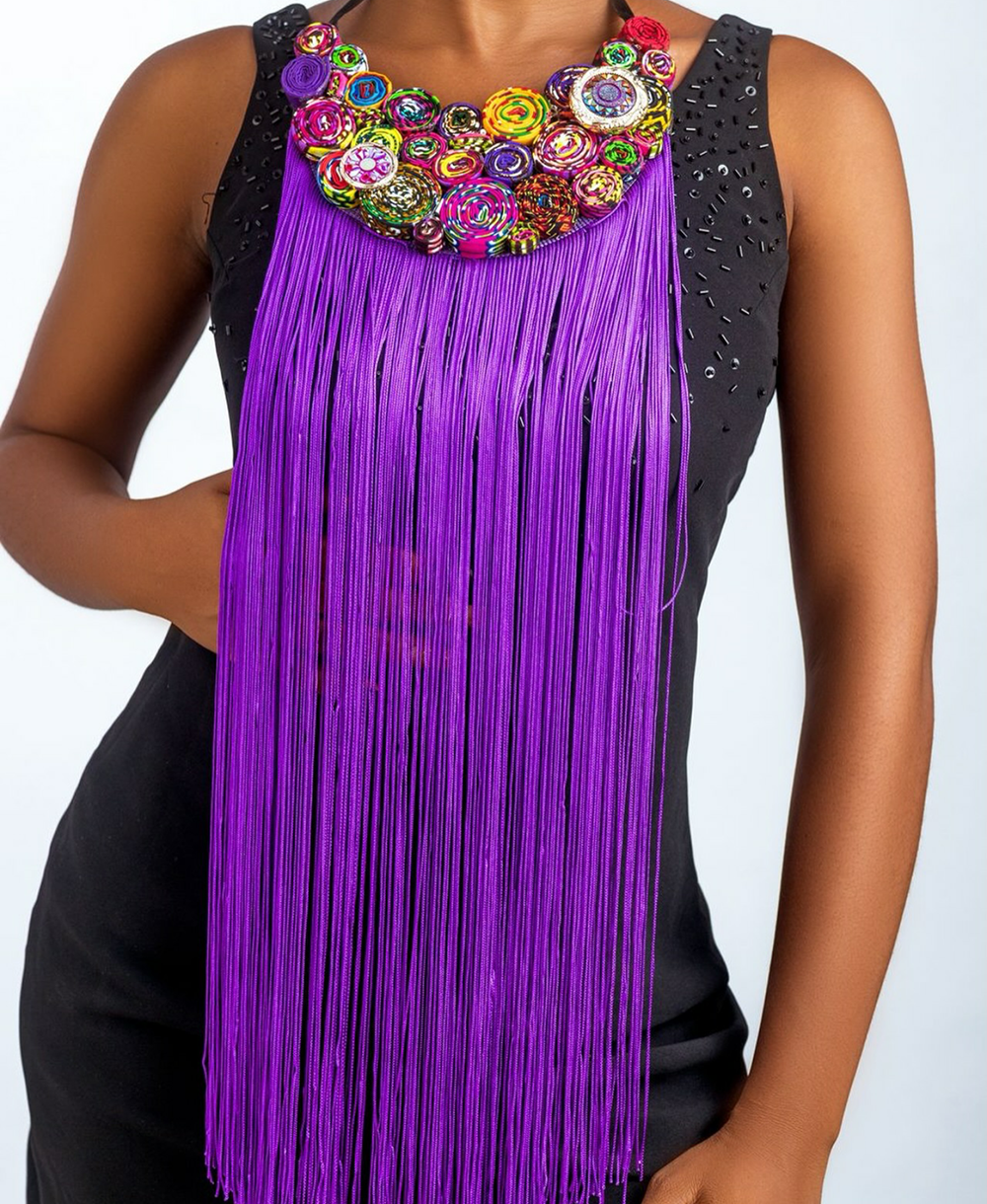 Another standout in the Poquaa GH collection is its bold statement necklaces crafted from strands of African print fabric.
