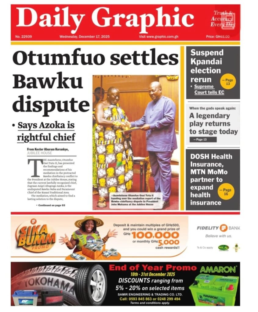 A series of political, legal and health developments are shaping headlines across Ghana today, December 17, 2025.