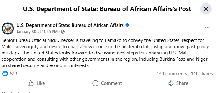 In a statement posted on Facebook by the U.S. Department of State’s Bureau of African Affairs, the department announced that Senior Bureau Official Nick Checker is traveling to Bamako to convey Washington’s “respect for Mali’s sovereignty” and its desire to “chart a new course in the bilateral relationship and move past policy missteps.”