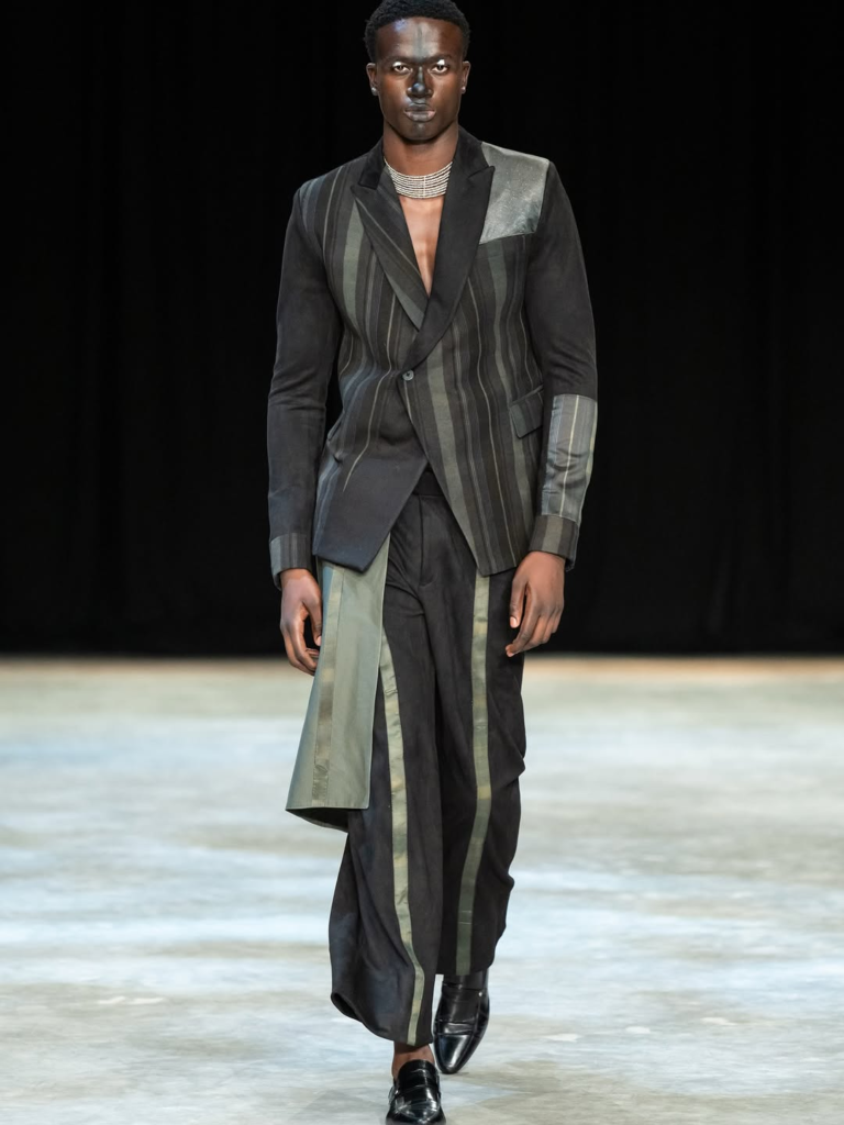He sidesteps obvious cultural motifs, instead presenting Africanness as an internal language—complex, evolving, and deeply personal. It’s fashion that doesn’t rely on recognition, but on resonance.