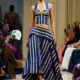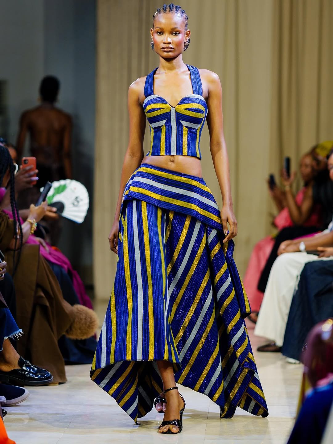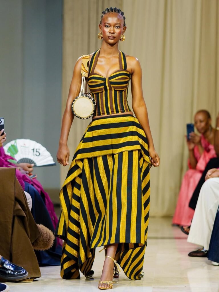But Hertunba didn’t linger in nostalgia. The collection pushed heritage into contemporary relevance. Structured corsetry met boldly striped fabrics, while layered skirts reinterpreted traditional weaving through modern tailoring.