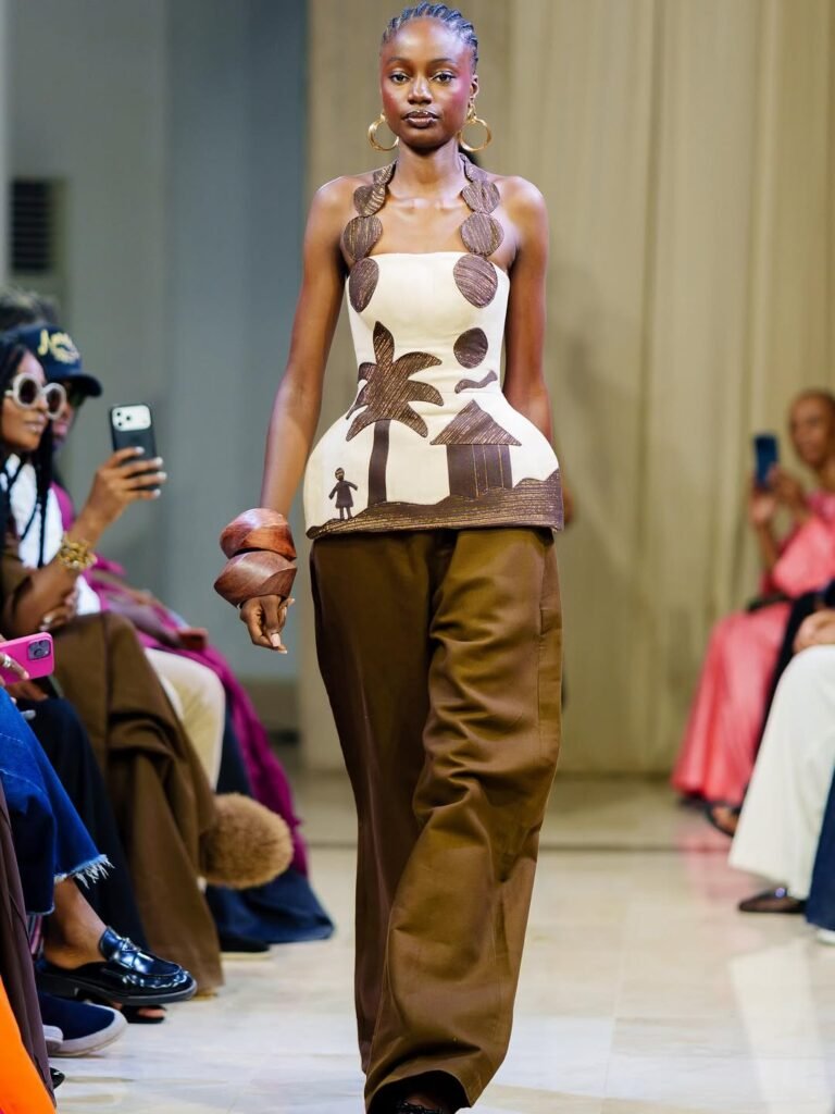 One standout piece, a sleek black gown finished with cascading multicoloured fringe, captured the collection’s central idea. It fused multiple craft traditions into a single silhouette, turning the body into a moving canvas of African artistry.