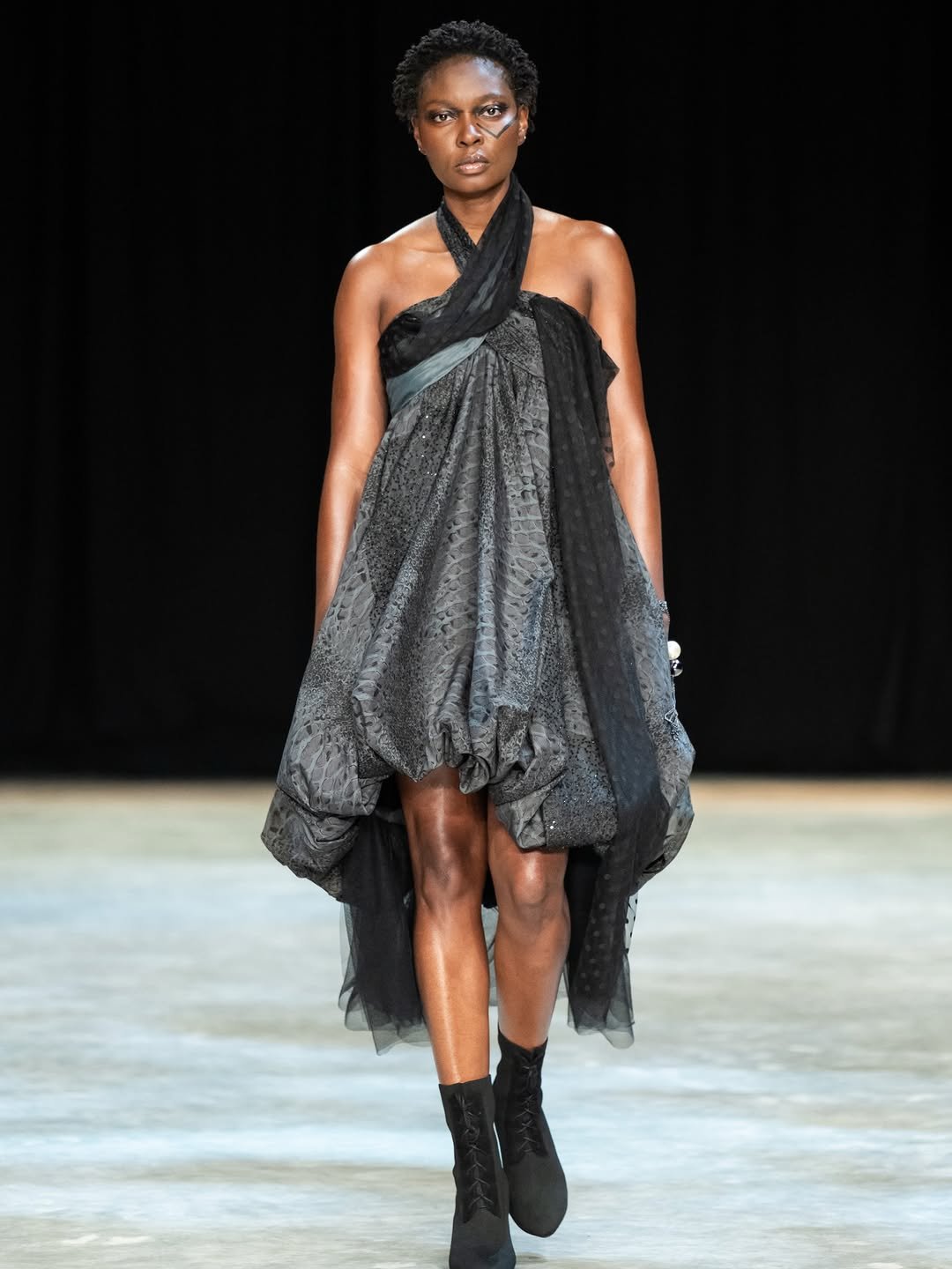 The collection’s strongest statement lay in its refusal to shout. Instead, it whispered with intent. Dominated by blacks, charcoals, and muted metallics, the palette created an atmosphere that felt almost ceremonial—clothing as armour, as ritual, as self-definition.